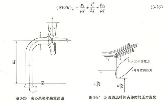 離心泵的吸水裝置在水泵運行時,由于葉輪高速旋轉,在其入口處形成了真空,進水池中的水流在大氣壓的作用下經過吸水管流至水泵進口,再從泵進口流入葉輪流道,壓力沿水流減小,到進入葉輪后,在葉片背面(即背水面)水流以相對速度W1,繞流葉片進口邊,由于急轉彎,流速加大,在葉片背面靠進口的K點處壓力降到低值,K點是水泵內容易產生汽蝕的點,如圖3-27所示。水泵是否會產生汽蝕,取決于K點處的壓力值,當K點的壓力pk下降到等于該泵工作溫度下的飽和汽化壓力p汽時,則泵內發生汽蝕。以后,水流在葉輪中得到葉片傳來的機械能,壓力迅速上升,因此汔蝕基本方程正是表征水泵汽蝕條件與影響汽蝕諸因素之間的關系式,其表達式如下: