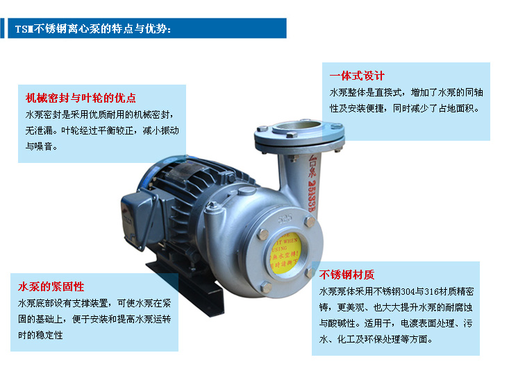 臺泉不銹鋼離心泵,泵體采用304、316精密鑄造成型,無砂孔問題。電機(jī)與泵體是一體形同軸設(shè)計(jì),不僅僅保證了電機(jī)的穩(wěn)固性,而且水泵占地面積小與噪音小的性能。水泵廣泛使用于電渡、涂裝、化工、PCB線路板、環(huán)保設(shè)備等方面。